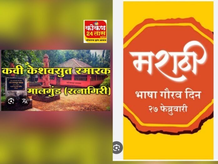 रत्नागिरी, (जिमाका) : 27 फेब्रुवारी हा दिवस कवी कुसुमाग्रज यांचा जन्म दिवस मराठी भाषा गौरव दिन म्हणून साजरा करण्यात येतो. याचे औचित्य साधून मराठी भाषा विभाग, मराठी भाषा समिती जिल्हाधिकारी कार्यालय आणि कोकण मराठी साहित्य परिषद, रत्नागिरी यांच्या संयुक्त विद्यमाने कवी केशवसुत स्मारक, मालगुंड येथे दुपारी 2 ते सायंकाळी 5 वाजता मराठी भाषा गौरव दिन साजरा करण्यात येणार आहे.