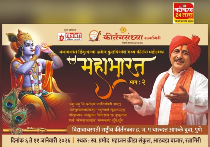रत्नागिरी : समाजप्रबोधनाचा वसा जोपासत गेली चौदा वर्षे रत्नागिरीत आयोजित केल्या जात असलेल्या कीर्तनसंध्या महोत्सवात येत्या जानेवारीमध्ये महाभारत या विषयावरील आणखी काही पैलू राष्ट्रीय कीर्तनकार विद्यावाचस्पती चारुदत्तबुवा आफळे उलगडून दाखवणार आहेत. यंदाचे या कीर्तन महोत्सवाचे पंधरावे वर्ष आहे.