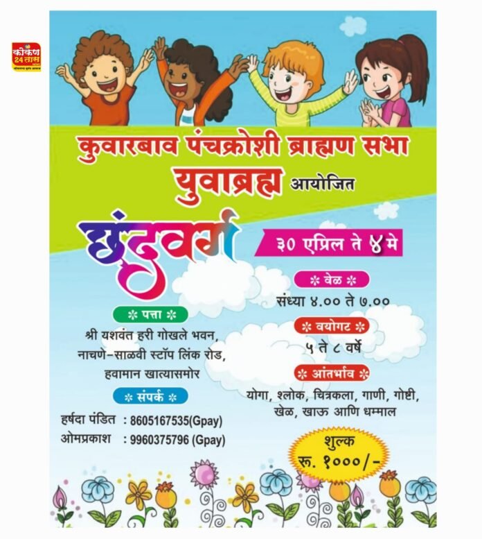 उन्हाळ्याच्या सुट्टी मध्ये मुलं एकत्र येऊन त्यांच्यामध्ये सर्वांगीण विकासाठी, आणि सुट्टी मध्ये होणारा मोबाईल आणि टीव्ही चा अतिवापर टाळून, त्यांना खेळ, आणि विविध उपक्रम यांची गोडी लावण्यासाठी यंदा ही “युवाब्रह्म” तर्फे 5 ते 8 वयोगटातील मुलांसाठी दि. 30 एप्रिल ते 4 मे 2025 या कालावधीत “छंद वर्ग” या उन्हाळी शिबिराचे आयोजन गोखले भवन, नाचणे – साळवी स्टॉप लिंक रोड, रत्नागिरी येथे करण्यात आले आहे.