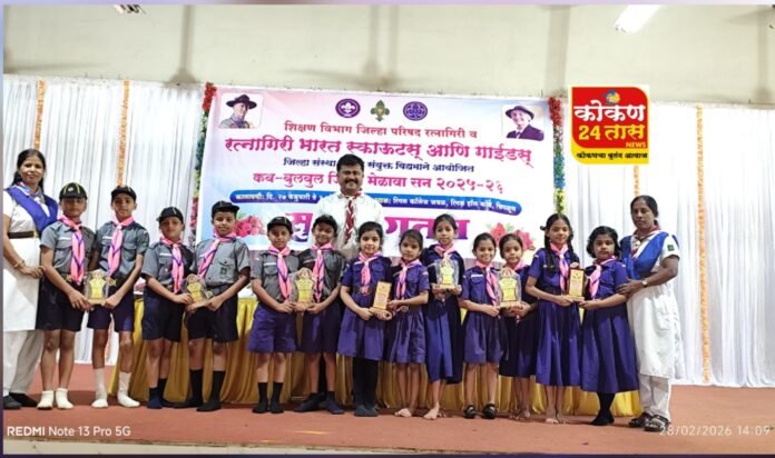 स्काऊटच्या विद्यार्थ्यांनी कब बुलबुल जिल्हा मेळावा 2025/26 चे शिक्षण विभाग जिल्हा परिषद रत्नागिरी भारत स्काऊट्स अँड गाईड्स रत्नागिरी जिल्हा संस्थेच्या संयुक्त विद्यमाने रिगल काॅलेज चिपळूण येथे आयोजित करण्यात आलेल्या कब-बुलबुल जिल्हास्तरीय 2025/26 मेळाव्यात शाळेच्या कब म्हणून सहा मुले रुद्र संदीप कदम, रुद्र चव्हाण, रुदांत कावणकर, राधेय वडके, तन्मय काटकर, रुद्र कदम या 6 विद्यार्थ्यांनी आणि बुलबुल म्हणून आरुषी मोरे, ओवी जंगम, वेदा मोरे, अन्वी कांबळे, खुशी लाले,ओवी पांढरे, काव्यांजली कदम या 7 विद्यार्थींनीनी चांगल्या प्रात्यक्षिकाचे सादरीकरण करून त्यामध्ये उत्तम यश संपादन केले. या स्पर्धेत शाळेने मिळवलेली बक्षिसे त्यामध्ये शारीरिक प्रात्यक्षिके स्पर्धा मुली प्रथम क्रमांक, शारीरिक प्रात्यक्षिके स्पर्धा मुले प्रथम क्रमांक, बौद्धिक स्पर्धा मुले तृतीय क्रमांक, बौद्धिक स्पर्धा मुली तृतीय क्रमांक, सांस्कृतिक स्पर्धा या विद्यार्थ्यांनी द्वितीय क्रमांक असे यश प्रदान करून अनेक बक्षिसे मिळवली. विद्यार्थ्यांच्या