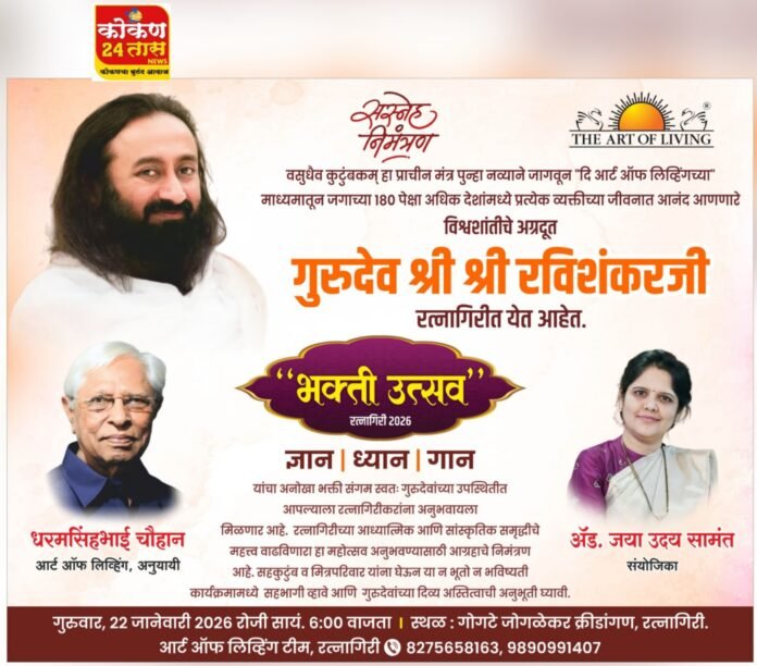 रत्नागिरी :कोकणची सांस्कृतिक राजधानी असलेल्या रत्नागिरी नगरीत लवकरच एक ऐतिहासिक आध्यात्मिक सोहळा संपन्न होणार आहे. जागतिक स्तरावर शांततेचा संदेश देणारे आणि आर्ट ऑफ लिव्हिंगचे प्रणेते गुरुदेव श्री श्री रविशंकर यांचे 22 जानेवारी रोजी रत्नागिरीत आगमन होत आहे. या खास भेटीच्या निमित्ताने शहरातील गोगटे-जोगळेकर महाविद्यालयाच्या विस्तीर्ण मैदानावर सायंकाळी 6 वाजता भव्य भक्ती उत्सव आयोजित करण्यात आला आहे.