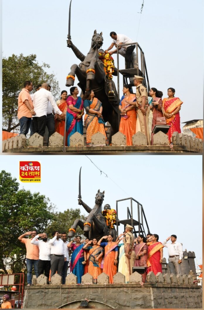 मारुती मंदिर येथील महाराजांच्या अश्वारुढ पुतळ्यास पोलीस अधिक्षक नितीन बगाटे यांच्या हस्ते पुष्पहार अर्पण करण्यात आला. अश्वारूढ पुतळ्यास पोलीस बँड पथकाकडून जिल्ह्यात पहिल्यांदाच विशेष सलामी देण्यात आली. पोलीस बँड पथकाने वाजवलेल्या धून आणि दिलेल्या सलामीने वातावरण अधिकच मंगलमय झाले. या मानवंदनेने आजच्या सोहळ्यास एक वेगळी उंची मिळाली. वातावरण शिवमय बनले होते.