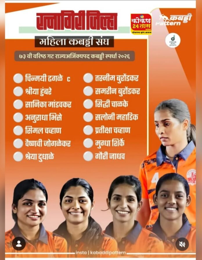 दि. २ ते ६ एप्रिल २०२६ या कालावधीत नाशिक ( सिन्नर ) येथे होणाऱ्या ७३ व्या राज्य अजिंक्यपद व निवड चाचणी कबड्डी स्पर्धेसाठी रत्नागिरी जिल्हा पुरुष व महिला संघ जाहीर