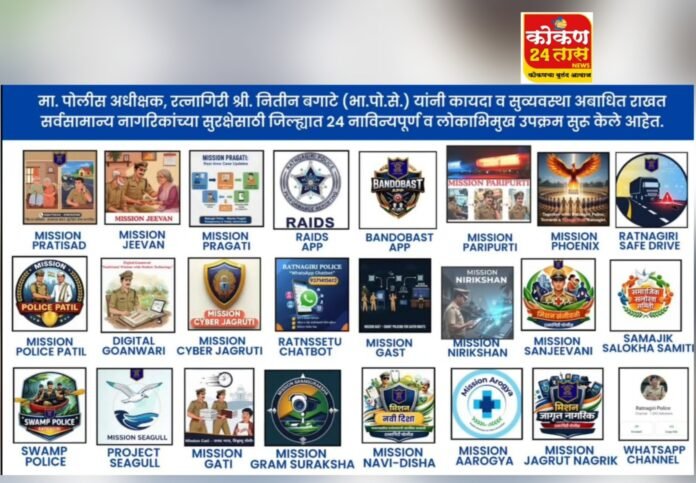 पोलीस अधिक्षक नितीन बगाटे यांनी कायदा व सुव्यवस्था अबाधित राखत सर्वसामान्य नागरिकांच्या सुरक्षेसाठी मिशन प्रतिसाद, मिशन जीवन, मिशन प्रगती, रेड्स ॲप, बंदोबस्त ॲप, मिशन परिपूर्ती, मिशन फिनिक्स, रत्नागिरी सेफ ड्राईव्ह, मिशन पोलीस पाटील, डिजिटल गाववारी, मिशन सायबर जागृती, रत्नसेतू चॅटबॉट, मिशन गस्त, मिशन निरीक्षण, स्वॅम्प पोलीस, प्रोजेक्ट सिगल, मिशन गती, मिशन ग्रामसुरक्षा, मिशन नवीदिशा, मिशन आरोग्य, मिशन जागृत नागरिक, व्हॉटसप चॅनेल असे जिल्ह्यात चोवीस नाविन्यपूर्ण व लोकाभिमुख उपक्रम सुरु केले आहेत.