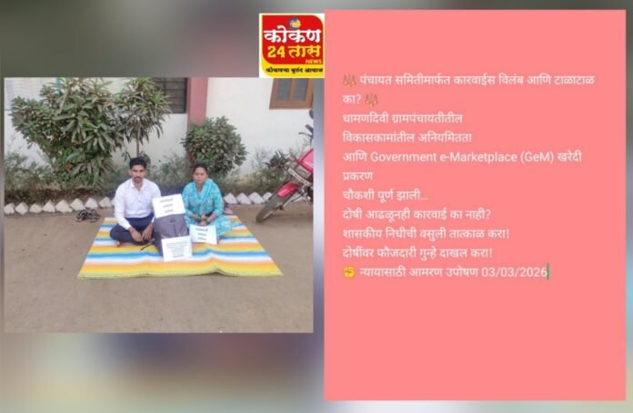 धामणदिवी ग्रामपंचायतीमध्ये 12 ते 15 लाखाचा अपहार झाल्याचा आरोपप्रकरणी उपोषणकर्ते संदेश पेवेकर यांचा दि. 3 मार्च 2026 पासुन खेड पंचायत समितीसमोर उपोषण सुरु