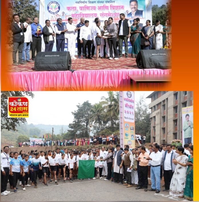 संगमेश्वर (प्रतिनिधी): नवनिर्माण महाविद्यालय संगमेश्वर यांच्या वतीने आयोजित करण्यात आलेल्या ‘नवनिर्माण मॅरेथॉन’ स्पर्धेला धावपटूंचा उत्स्फूर्त प्रतिसाद लाभला. तालुक्यातील आणि परिसरातील सुमारे ७०० स्पर्धकांनी विविध वयोगटांत सहभागी होऊन आपली शारीरिक क्षमता आणि जिद्दीचे प्रदर्शन केले. या स्पर्धेत ऋषभ दसम, राज धुळप, दीपाली शिंदे आणि गौरी कदम यांनी आपापल्या गटात अव्वल स्थान पटकावत विजयावर शिक्कामोर्तब केले.