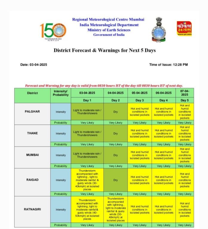 भारतीय हवामान विभाग यांचेकडून हवामान विषयक प्राप्त माहितीनुसार रत्नागिरी जिल्ह्यात दिनांक 03 व 04 एप्रिल 2025 रोजी जिल्ह्यातील काही ठिकाणी वादळी वारे व वीजांच्या गडगटासह पाउस होण्याची शक्यता आहे. तसेच दिनांक 05 ते 07 एप्रिल 2025 या कालावधीत काही ठिकाणी उष्ण व दमट हवामान राहण्याची शक्यता वर्तविण्यात आलेली आहे.
