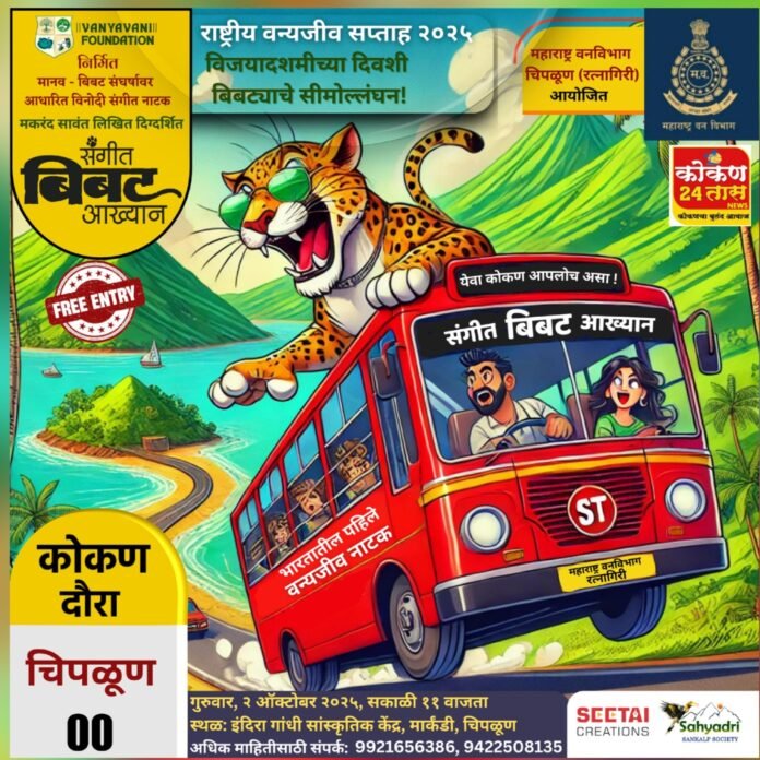 भारताच्या नाट्यपरंपरेत मैलाचा दगड ठरलेले, देशातील पहिले वन्यजीव नाटक म्हणून लौकिक मिळवलेले ‘संगीत बिबत आख्यान’ हे धमाल विनोदी नाटक २ ऑक्टोबर २०२५ रोजी सकाळी ११ वाजता चिपळूण येथील इंदिरा गांधी सांस्कृतिक केंद्रात सादर होणार आहे. निसर्ग आणि मानवी सहजीवनाचा एक अदृश्य अध्याय उलगडणारे हे नाटक, केवळ मनोरंजकच नव्हे तर विचारप्रवर्तक अनुभव देईल.