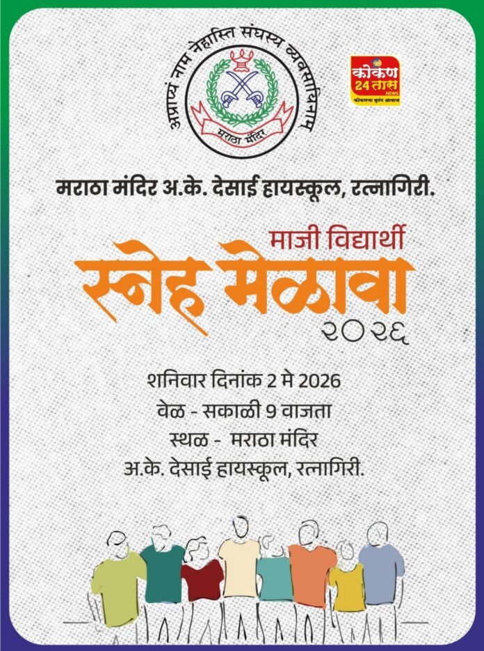 शनिवार २ मे रोजी मराठा मंदिर, अ. के. देसाई हायस्कूलमध्ये माजी विद्यार्थी मेळाव्याचे आयोजन शनिवार दिनांक 02 / 05 / 2026 रोजी मराठा मंदिर अ. के. देसाई हायस्कूल रत्नागिरी येथे शाळेच्या माजी विद्यार्थ्यांचा मेळावा आयोजित करण्यात आला आहे. सकाळी नऊ वाजता नाव नोंदणीने सदर मेळाव्याची सुरुवात झाल्यानंतर असा मी घडलो या कार्यक्रमामध्ये माजी विद्यार्थी व शिक्षकांची मनोगते व्यक्त होणार आहेत. दुपारच्या भोजनानंतर गप्पाटप्पा, मनोरंजक खेळ , माजी विद्यार्थ्यांचे सांस्कृतिक कार्यक्रम अशा विविध प्रकारे हा मेळावा संपन्न होणार आहे. तरी शाळेच्या सर्व माजी विद्यार्थ्यांनी शनिवार दिनांक 2 मे 2026 रोजी माजी विद्यार्थी मेळाव्यास उपस्थित राहावे असे आवाहन प्रशालेच्या मुख्याध्यापिका सौ. अंजली पिलणकर, सर्व शिक्षक व शिक्षकेतर कर्मचारी आणि माजी विद्यार्थी संघाचे सदस्य श्री.रणजीत सुवारे,श्री.सुदेश निवळकर,श्री.अभिजीत गोडबोले, श्री. योगेश कोरगावकर, श्री.आकाश परीट, श्री.प्रणित मेस्त्री,श्री.अक्षय पाखरे,श्री.अनिकेत जाधव,श्री.अच्युत गजबिये, आलीशा जाधव, रिया मांडवकर, शाकिब मुल्ला,श्री.सुशांत पवार,श्री.जीवन जाधव, श्री.प्रकाश पालकर यांनी केले आहे.