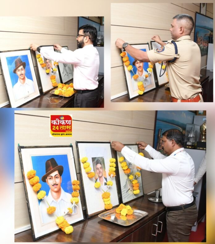 रत्नागिरी, (जिमाका) : शहीद दिनानिमित्त जिल्हाधिकारी मनुज जिंदल, पोलीस अधीक्षक नितीन बगाटे आणि निवासी उपजिल्हाधिकारी चंद्रकांत सूर्यवंशी यांनी जिल्हाधिकारी कार्यालयात शहीद भगतसिंग, राजगुरू आणि सुखदेव यांच्या प्रतिमांना पुष्पहार अर्पण करून अभिवादन केले.