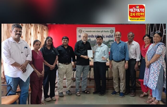रत्नागिरी: डॉ. बाळासाहेब सावंत कोंकण कृषी विद्यापीठ, दापोली अंतर्गत रत्नागिरीतील झाडगाव येथील सागरी जीवशास्त्रीय संशोधन केंद्रातील कर्मचारी कल्याणासाठी मंगळवार, २४ फेब्रुवारी २०२६ रोजी विशेष ‘मेडिकल हेल्थ कार्ड’ वाटप आणि आरोग्य तपासणी शिबिराचे आयोजन करण्यात आले होते. हे शिबिर लोकमान्य बाळ गंगाधर टिळक मल्टि-स्पेशालिटी हॉस्पिटल, रत्नागिरी यांच्या सहकार्याने यशस्वीरित्या पार पडले.
