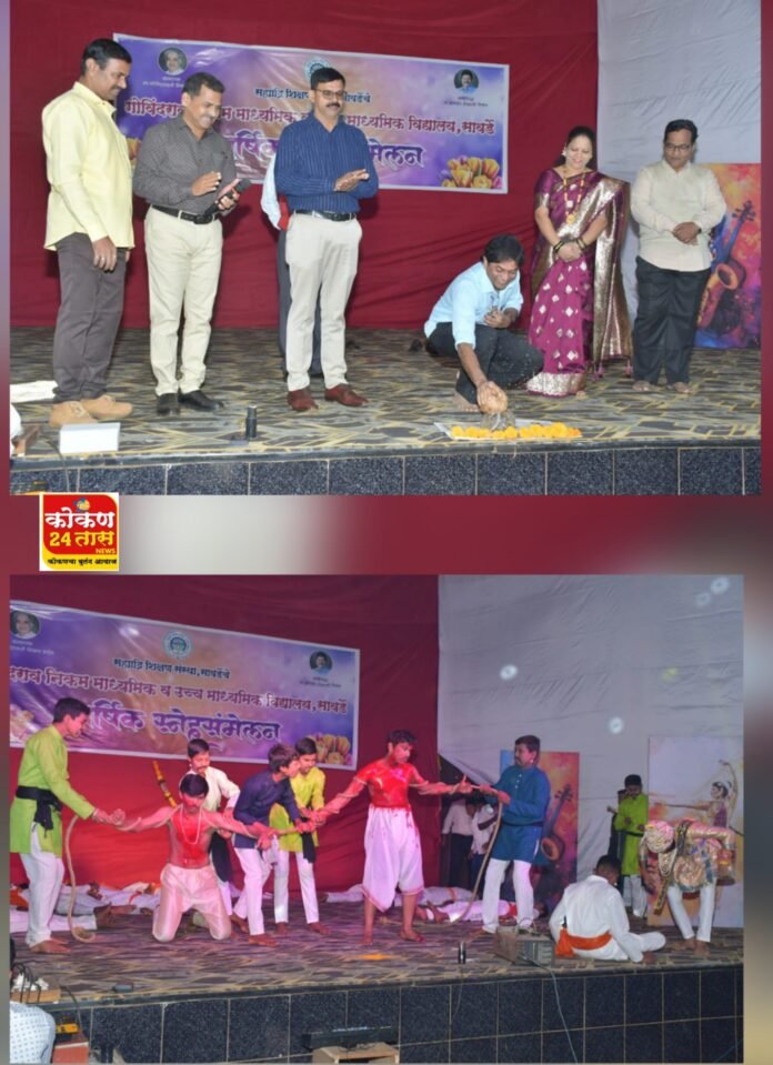विद्यार्थ्यांना शुभेच्छा देताना सौ. पूजाताई निकम व विश्वस्त शांताराम खानविलकर, तर रंगमंचावर विविध कलाविष्कार सादर करताना विद्यार्थी असे प्रेरणादायी दृश्य स्नेहसंमेलनात पाहायला मिळाले.