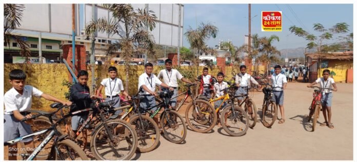 सायकल व पायी चालत शाळेत येताना विद्यार्थी